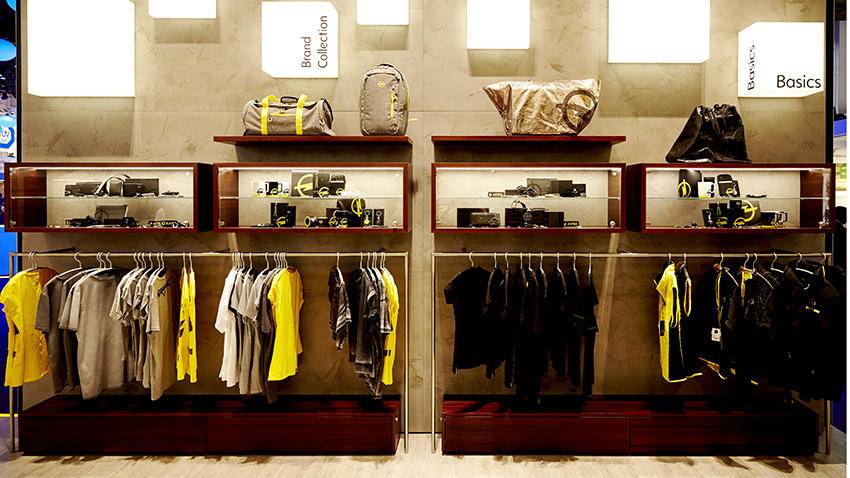 Wie in einer edlen Boutique hängen die hochwertigen schwarzen, gelben und grauen Shirts, Jacken und Westen aufgereiht nebeneinander. Versehen mit aufwendigen Opel Blitz-Applikationen und Stickereien. „Auf Qualität haben wir bei unseren Produkten immer schon Wert gelegt, jetzt haben wir in puncto Design noch mal nachgelegt“, erklären Gunnar Sprinkmann und Waldemar Kunoff vom Merchandising Team. Und das freut die Kunden: Allein in den letzten zwei Minuten sind ein Shirt, zwei Schlüsselanhänger, eine Weste, ein Block und ein Stift über den Tresen gewandert. „Exklusiv zur IAA haben wir rund 40 Artikel neu im Sortiment, die erst in ein paar Wochen in die Opel-Shops kommen werden“, sagt Sprinkmann.