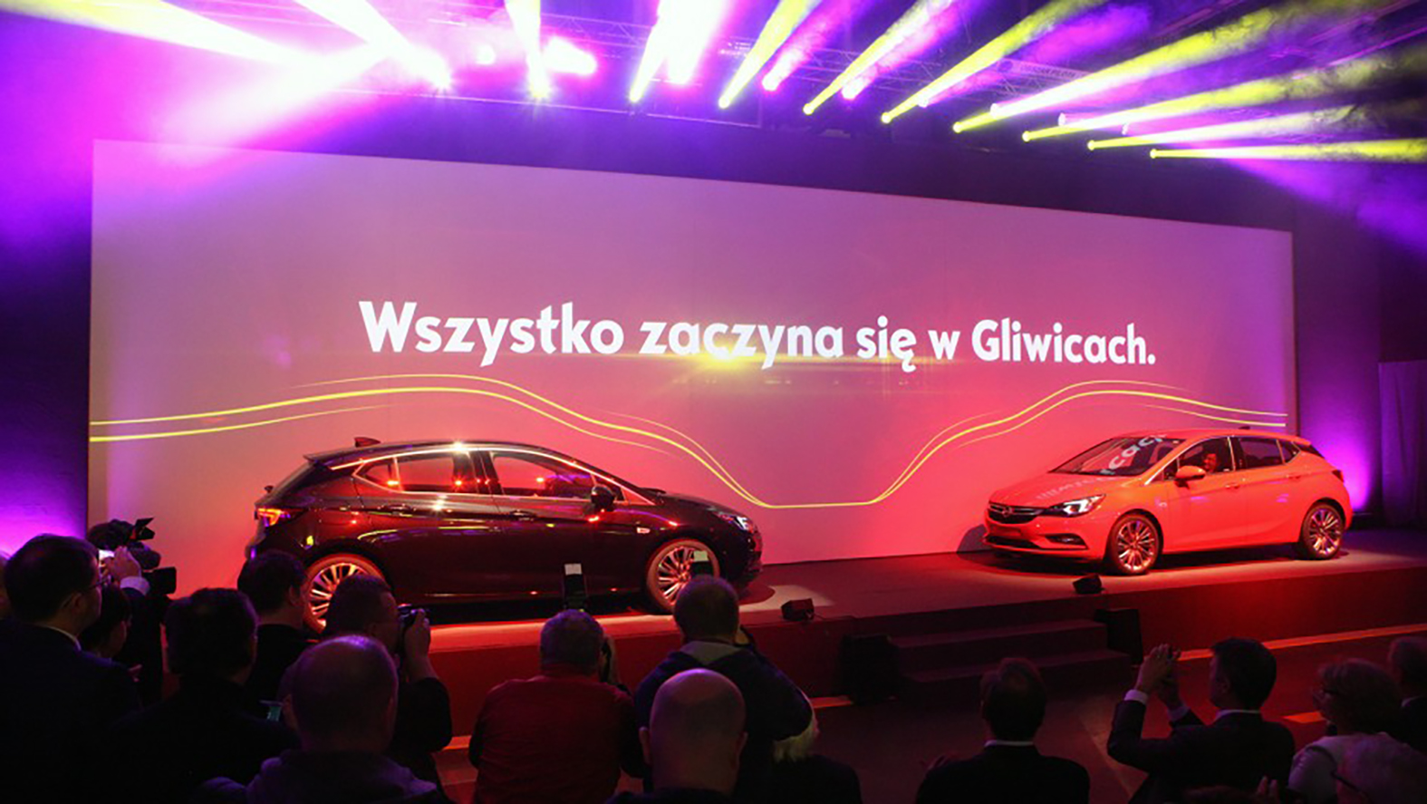 - Astra K, której pierwszy egzemplarz został wyprodukowany 29 września 2015 roku, jest zwyciężczynią prestiżowego plebiscytu Europejski Samochód Roku 2016 roku. Najnowsza Astra to pierwszy model na rynku, który wprowadza technologie premium do dostępnego dla wszystkich samochodu kompaktowego. W ramach standardowego wyposażenia klienci otrzymują światła do jazdy dziennej wykonane w technologii LED, podgrzewanie oraz elektryczne sterowanie lusterek, elektryczne sterowanie szyb przednich, aktywne wspomaganie kierownicy, systemy ABS, ESP, HSA. W zależności od wersji pojazd może być wyposażony także m.in. w system multimedialny z 4 lub 6-głośnikami oraz 7-calowym lub 9-calowym ekranem dotykowym, nawigację, kamerę cofania, system zmiany trybu jazdy – Sport, kamerę Opel-Eye z systemem ostrzegania przed kolizją i automatycznego hamowania przy niskich prędkościach, system ostrzegania o niezamierzonej zmianie pasa ruchu z układem utrzymania pasa ruchu, system rozpoznawania znaków drogowych, a także matrycowe reflektory przednie IntelliLux.