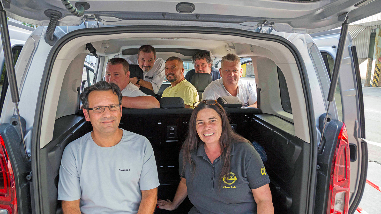 - Groß(artig)es Platzangebot: Josef Loggia, Dirk Schmidt, Harald Fürtig, Mehmet Danisman, Ulrich Rohweder, Andreas Grunwald, Sabine Preß (von hinten links nach vorne rechts) im neuen Opel Combo Life.