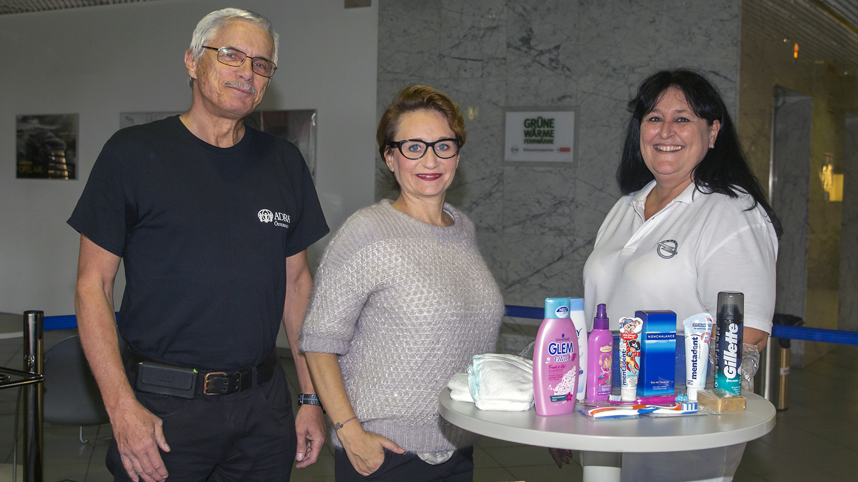 Elisabeth Schuller/Leiterin Unternehmenskommunikation hatte sich an Robert Himmler gewandt, um über seine Organisation die Mitarbeiter-Spenden für Flüchtlinge „an den rechten Mann“ zu bringen. Sie erklärt dazu: „Wir wollen helfen. Dabei ist uns wichtig, dass die Logistik auch wirklich funktioniert. Mit ADRA haben wir schon bei der Weihnachtsaktion 2015 sehr gute Erfahrungen gemacht.“ Die Spenden werden bei Rezeptionistin Sabine Mandl gesammelt – Elisabeth Schuller veröffentlichte dazu in den „aspern news“ Aufrufe. Sabine Mandl verständigt Robert Himmler, sobald ausreichende Spendenmengen zum Abholen bereit liegen. Den Rest besorgt das ADRA-Team. Zum Beispiel überbrachten sie die von den Opel Wien-MitarbeiterInnen gesammelten Hygiene-Artikel zwei syrischen Flüchtlingsfamilien, die in Sieghartskirchen untergebracht sind: einmal zwei Geschwister mit ihrem Cousin – alle drei Studenten, zum anderen die Familie eines 46-jährigen Innenarchitekten – Vater und Mutter und 17-jähriger Sohn, der gerade dabei ist Matura zu machen.