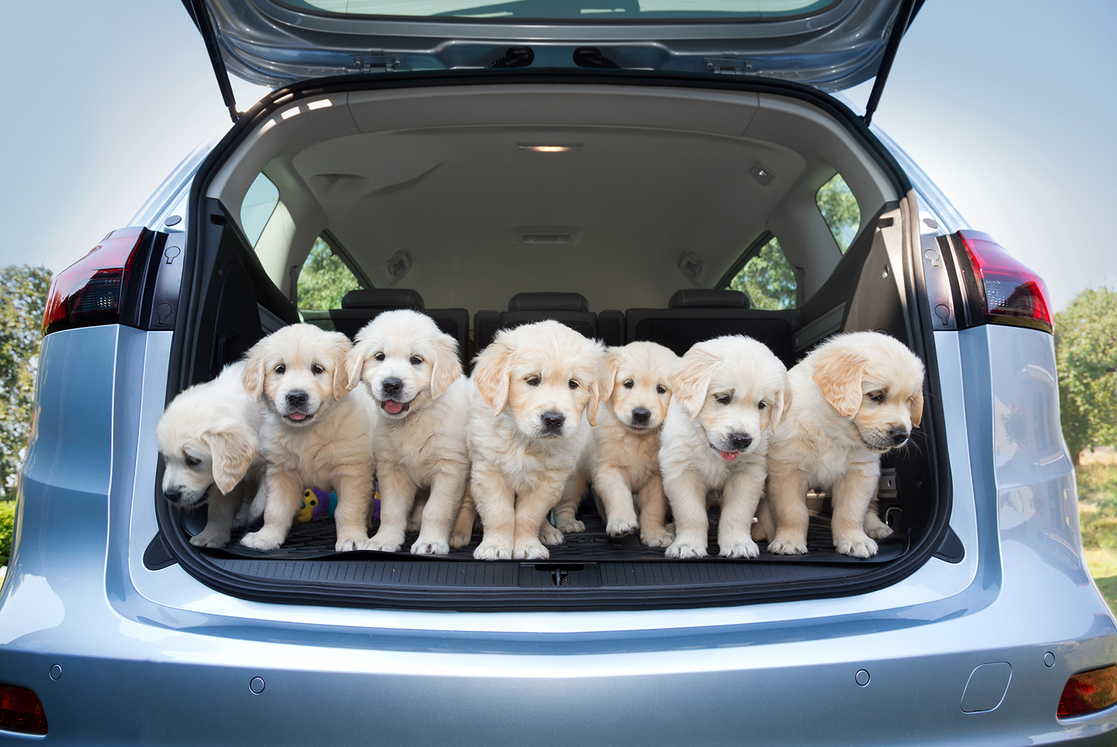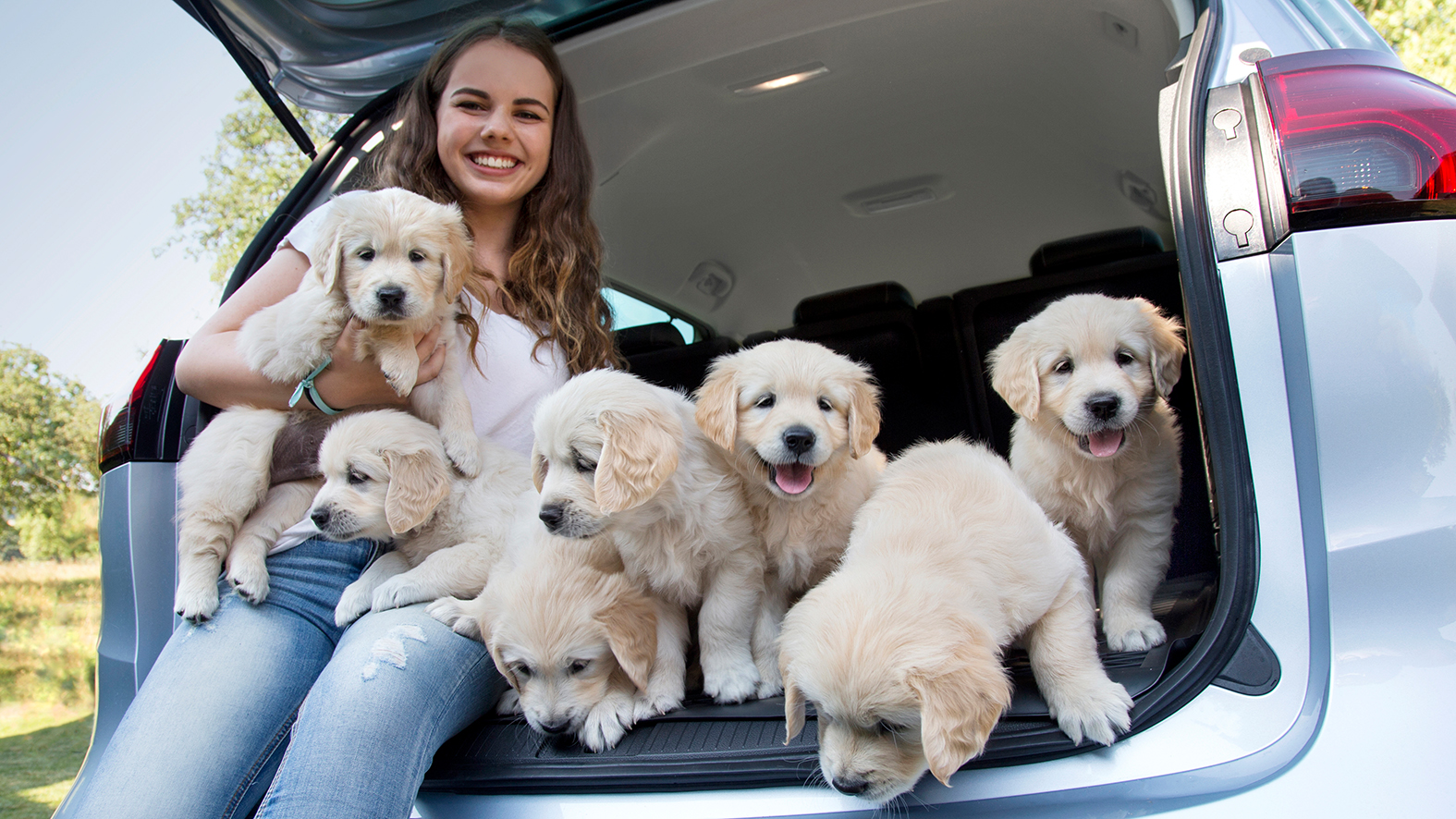 Ohne Probleme lassen sich die Welpen im geräumigen Kofferraum mitsamt dem passenden Hundezubehör positionieren. Alles scheint reibungslos zu funktionieren, und Thorsten beginnt zu fotografieren. Doch nur Sekunden später sind die ersten kleinen Hunde schon wieder aus dem Laderaum herausgesprungen. Nach kleineren Fauxpas und vielen Versuchen ist dann doch das perfekte Foto dabei.
