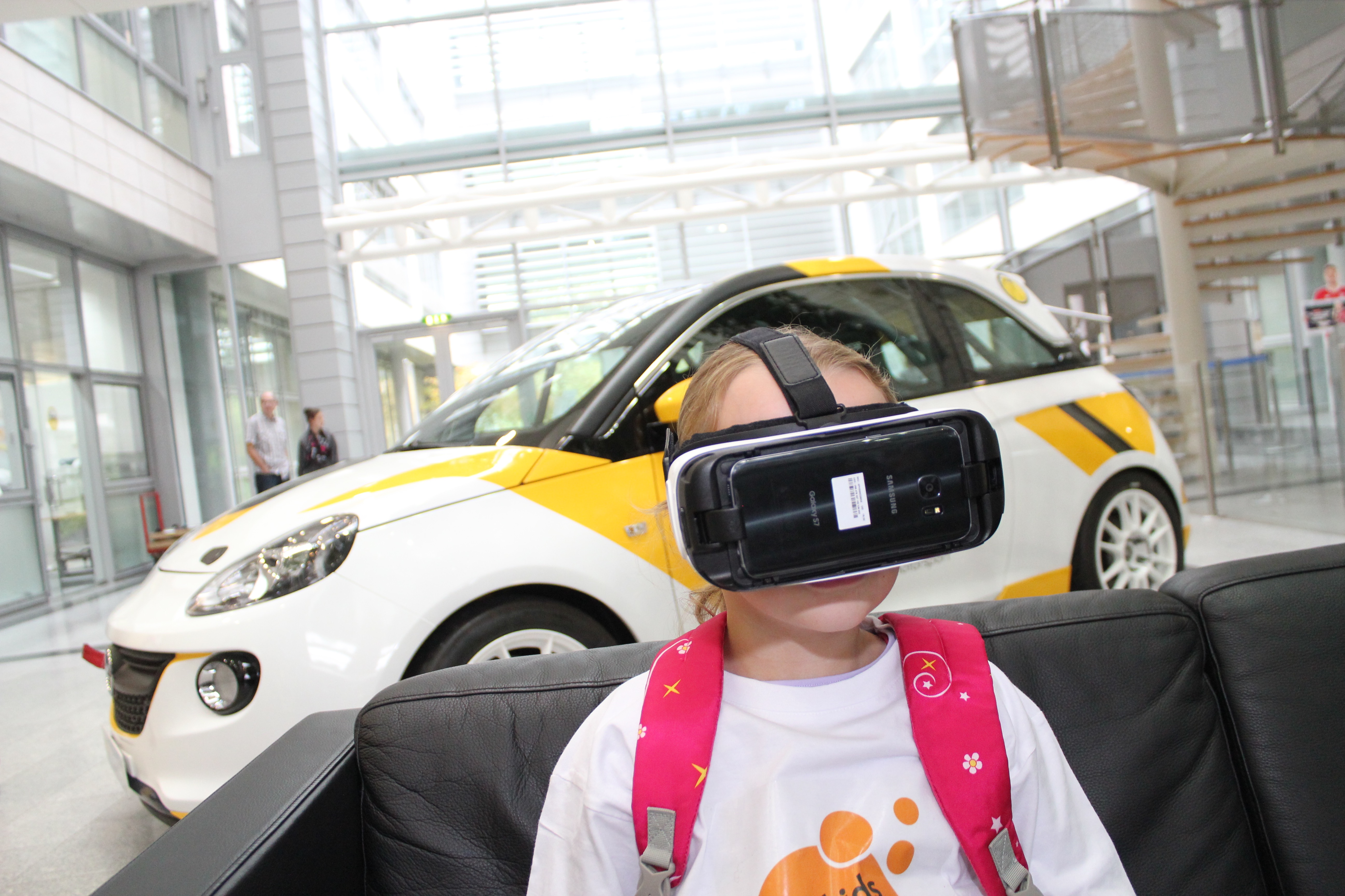 Gewissenhaft schreiben Mariola und Sarah den Namen der nächsten Station von einem Schild ab. Das ist aber auch kompliziert: „Virtual Reality Demo“. Die Schlange ist lang. Alle Kinder wollen die coole Brille ausprobieren. Michelle ist die Erste aus dem Reporter-Team, die eine ergattern kann: „Wahnsinn, ich fahre Achterbahn“, sagt sie und lehnt sich auf dem schwarzen Ledersofa in die Kurve, die nur sie sehen kann.