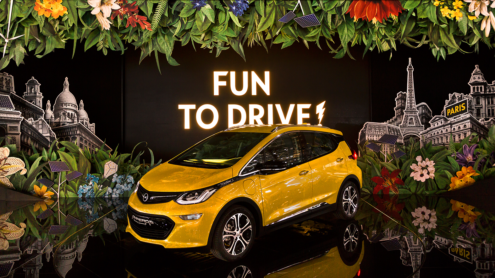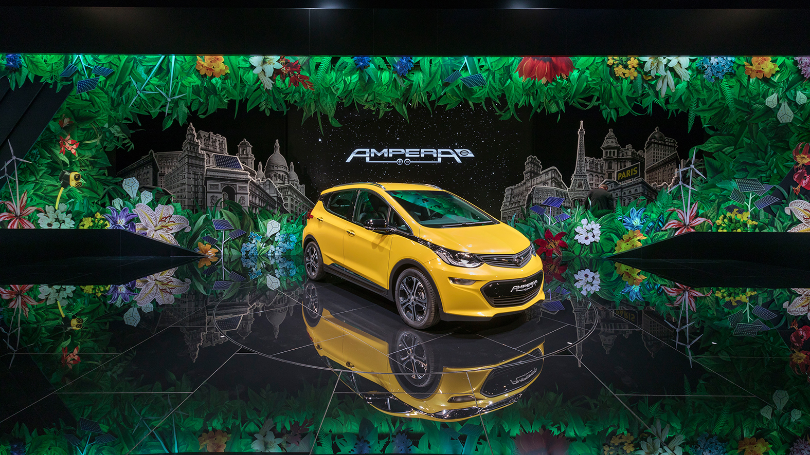Los últimos días del verano de París. En el centro del escenario, en amarillo sobre negro, se halla el indiscutible plato fuerte, la estrella del Salón: el Ampera-e. Simplemente electrizante.