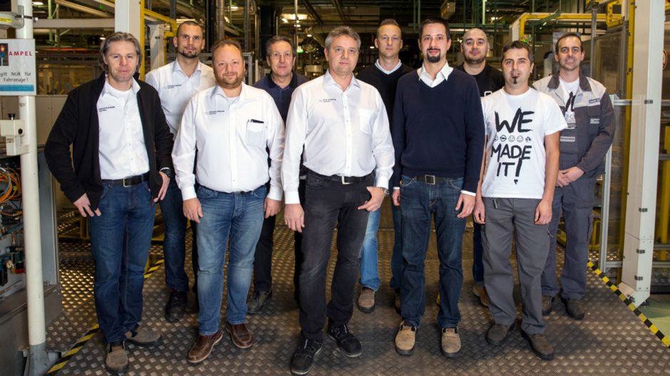 - 12. Dezember 2016: Fertigungsbeginn M3x-Sechsgang-Getriebe (v.l.n.r.: Helmut Kornthaler, Christian Dallinger, Christian Völk, Ercan Acsoy, Erich Gutzelnig, Thomas Strasak, Michael Lackner, Kahled Jaddah, Andreas Payan, Harald Kaintz).