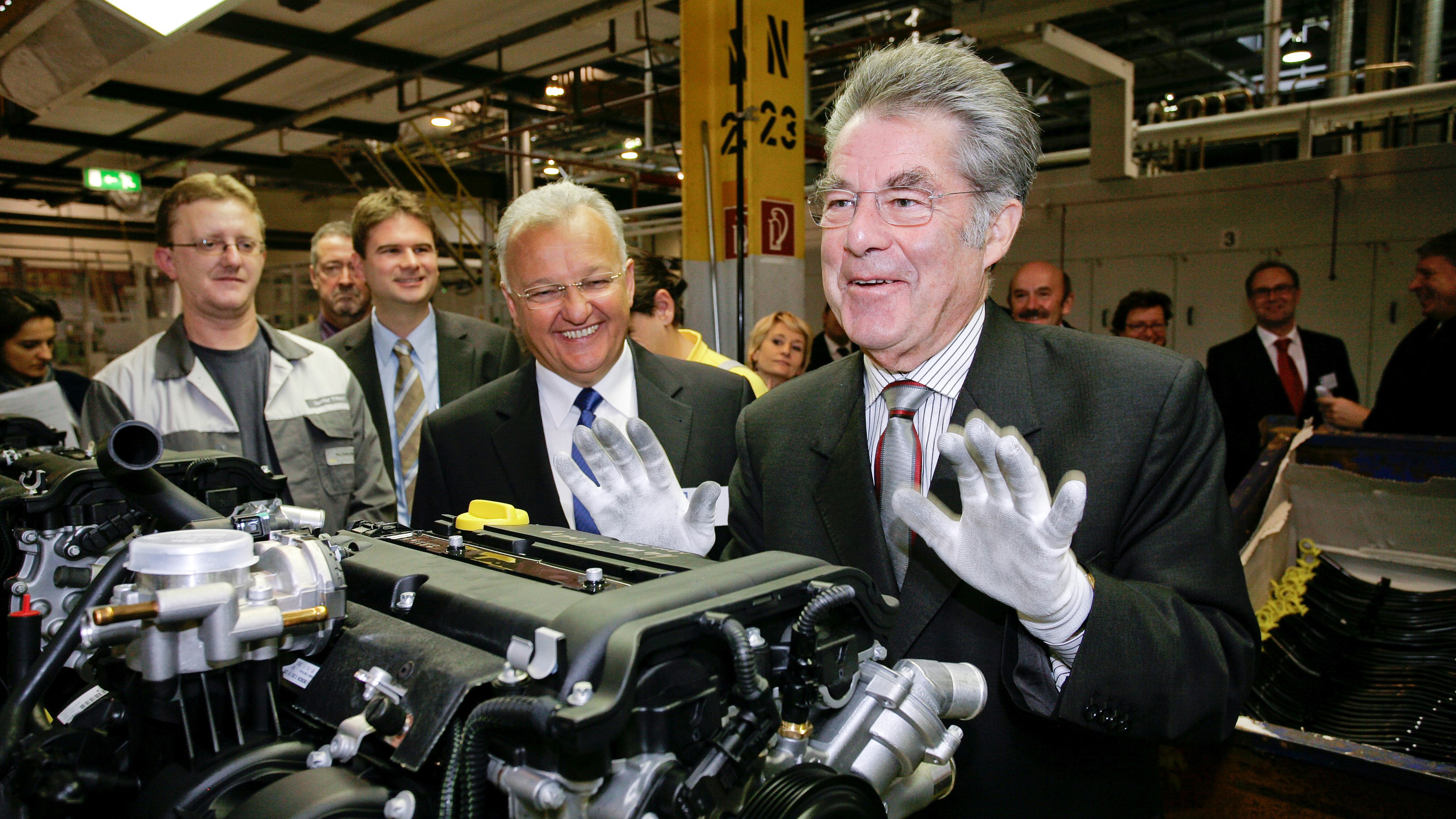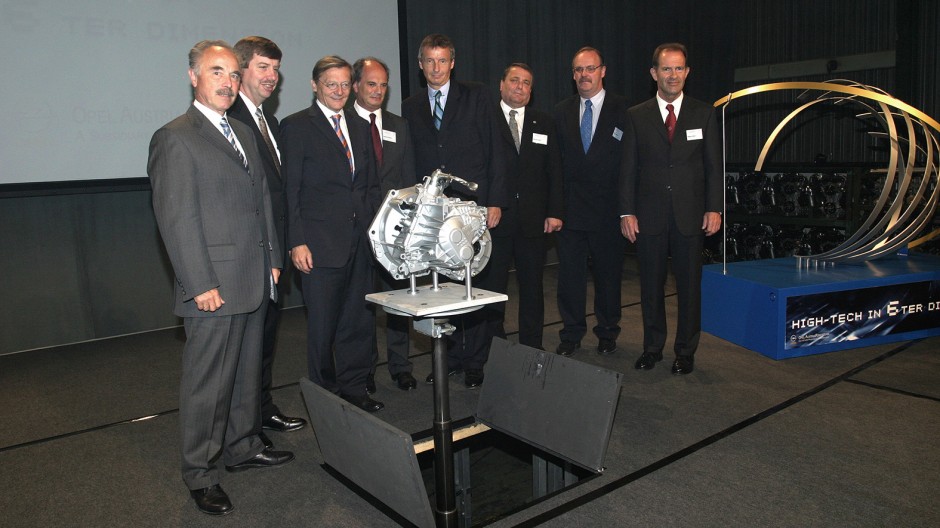 - 30. Juni 2004: Eröffnung Sechsgang-Getriebewerk (v.l.n.r.: Wiens Vizebürgermeister Dr. Sepp Rieder, Dan Hancock/CEO FIAT-GM Powertrain, Bundeskanzler Dr. Wolfgang Schüssel, Nunzio Pulvirenti/Chairman FIAT-GM Powertrain, Wirtschaftsminister Dr. Martin Bartenstein, Gesamtbetriebsratsvorsitzender Werner Lahner, Rodney Keane/Vice President Manufacturing FIAT-GM Powertrain, Generaldirektor Werner Hackl).