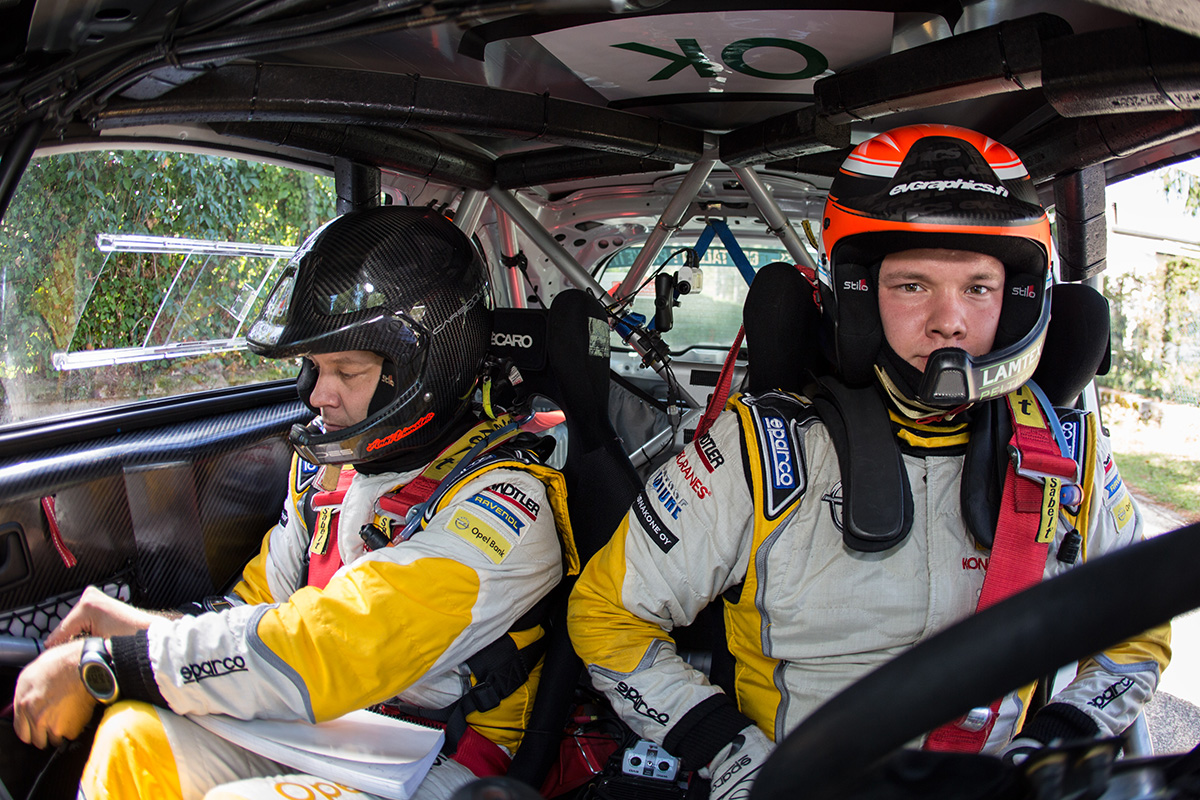 So auch bei Jari und Antti. Bis zur nächsten Möglichkeit, ein weiteres Reserverad zu montieren, lagen nicht nur der Rest dieser, sondern noch zwei weitere Wertungsprüfungen sowie die Rückfahrt zum Serviceplatz. Doch Aufgeben kommt für Jari Huttunen nicht infrage. Der Schützling von Ex-Rallye-Weltmeister Marcus Grönholm, kennt nur eine Gangart: volle Pulle, egal mit wie vielen Rädern. Also rasten die Finnen auf drei intakten Reifen und einer nackten Felge hinten links durch nachfolgenden Wertungsprüfungen – und das so hurtig, dass sie insgesamt nur zwei Minuten auf Ingram verloren! „Das war heroisch“, staunte selbst Opel Motorsport Direktor Jörg Schrott.