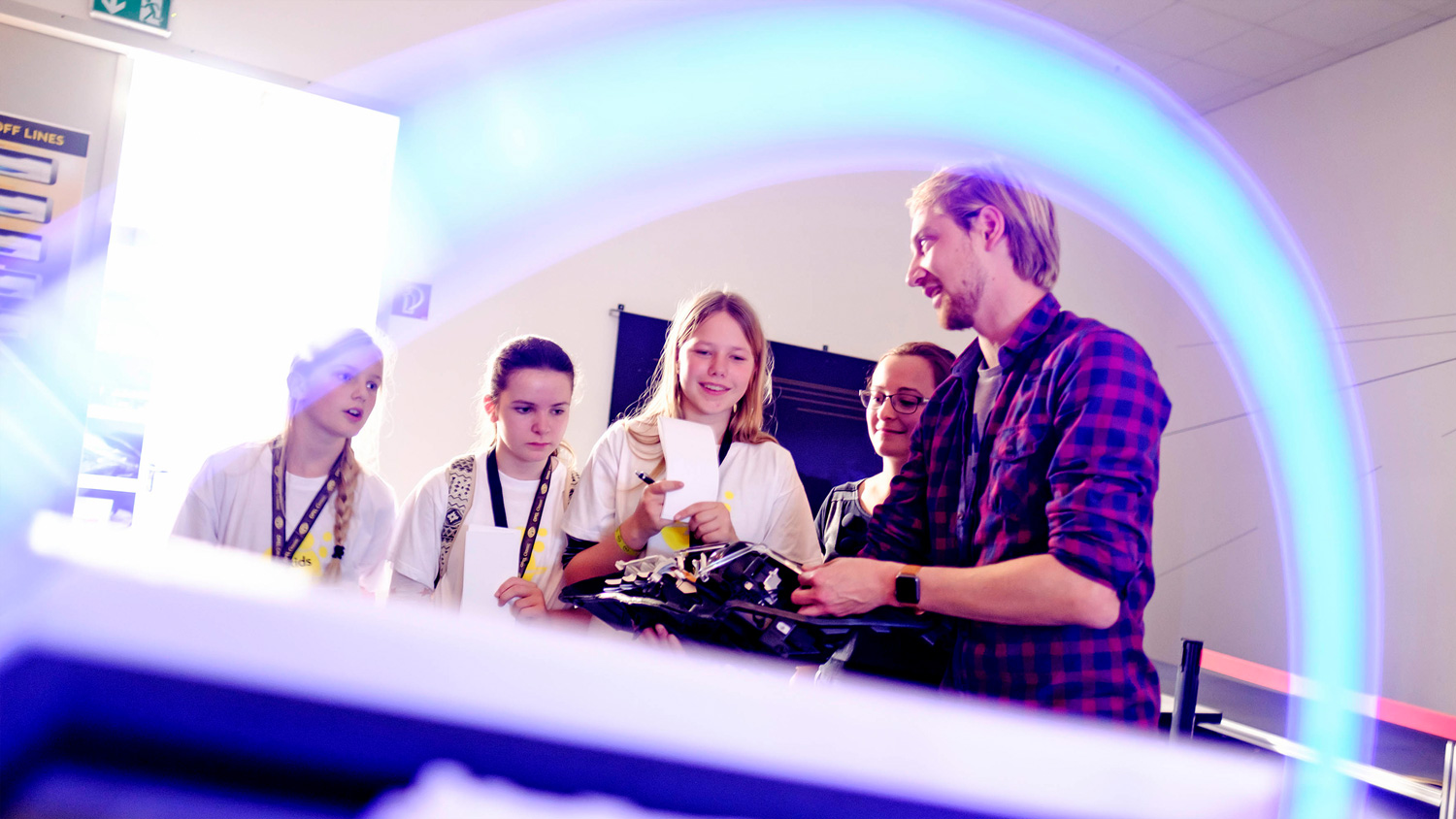 Eye-Tracking Leonie sitzt an dem Versuchsaufbau und steuert die Lichtkegel mit ihren Augen.