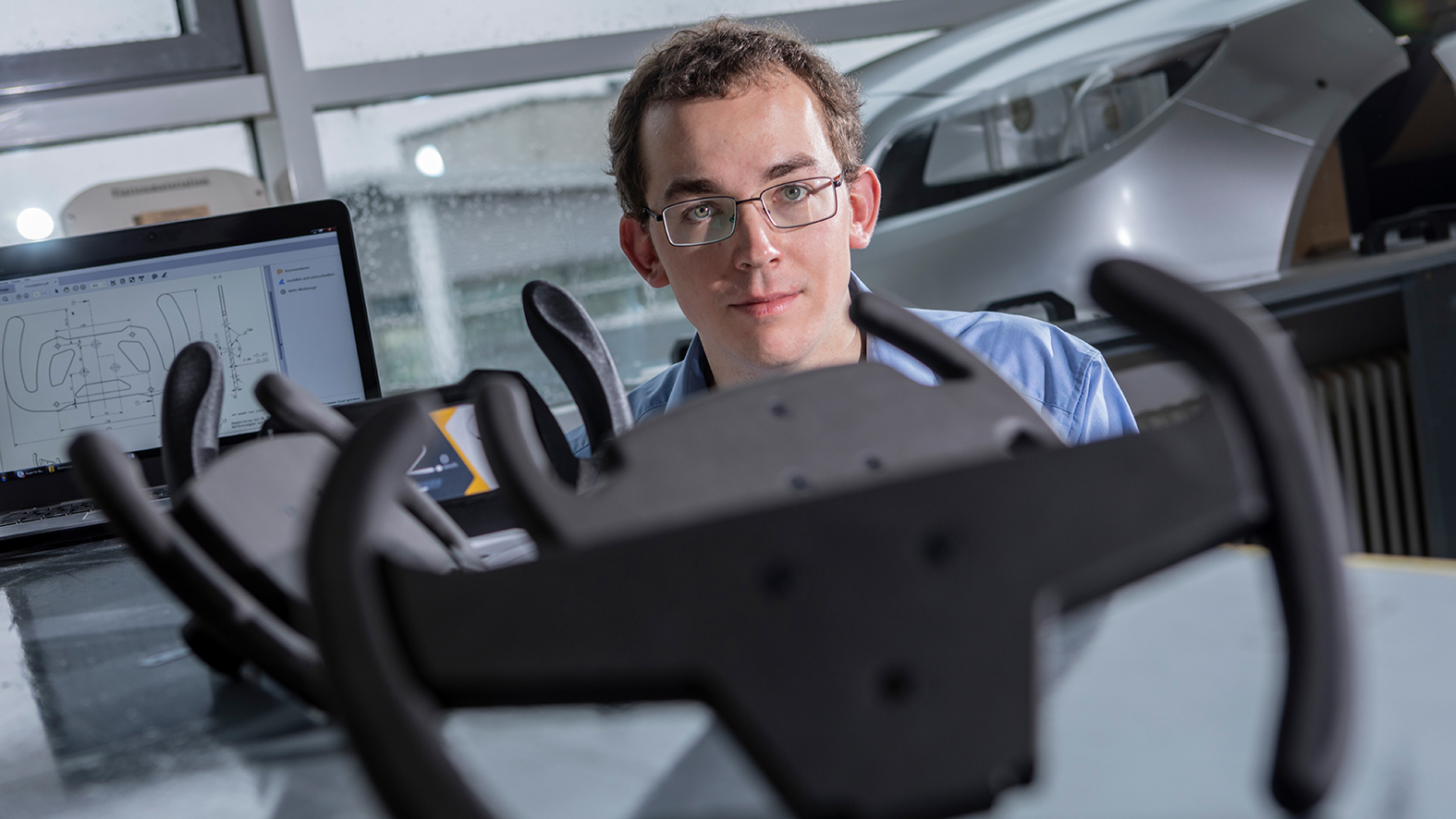 Die Abwechslung: Ab dem zweiten Jahr habe ich in den Betrieben gearbeitet – in verschiedenen Design-Bereichen, im Werkzeugbau und in der Vorausentwicklung. Bis zum Ausbildungsende gab es immer wieder Lehrgänge in der Werkstatt, unter anderem über Metalle, 3D-Druck, Pneumatik, aber auch zum Präsentieren und Dokumentieren. Am Ende der Lehrzeit habe ich die Abschlussprüfung mit einem Projekt bei meinem Ausbilder abgelegt. Dies wäre aber auch im Betrieb möglich gewesen.