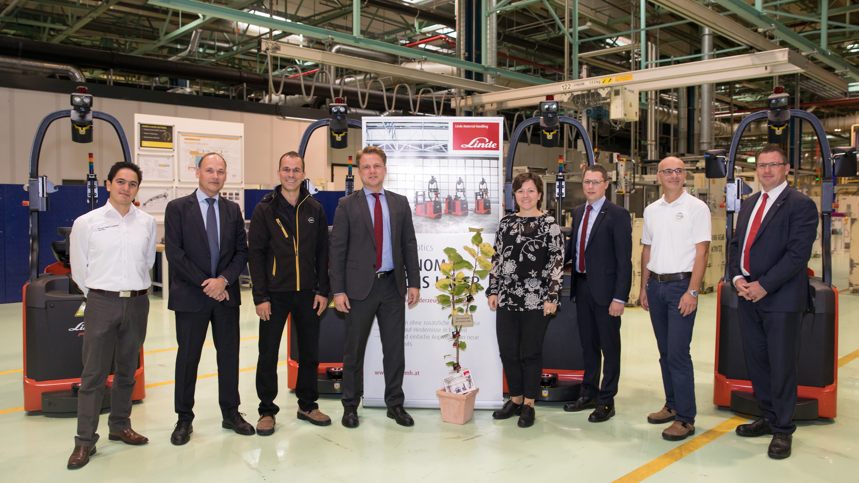 - Feier zur Übergabe der sechs automatischen Fahrzeuge am 16. Oktober 2017 (v.l.n.r.): Ricardo Ralon-Contreras/Kernteam GSC, Christian Feichtinger/Vertrieb Linde Österreich, Clemens Fath/Fertigungsleiter Motorbau, Dkfm. Sven Kaulbach/Geschäftsführer Linde Österreich, Katrin Grandl/Manager Material Handling GSC, Manuel Dort/ Produktmanagement Automatisierung Robotics Linde Österreich, Hansjörg Frommknecht/Bereichsleiter GSC, Thomas Egelseer-Bründl/Key Account Manager Intralogistik Linde Österreich.