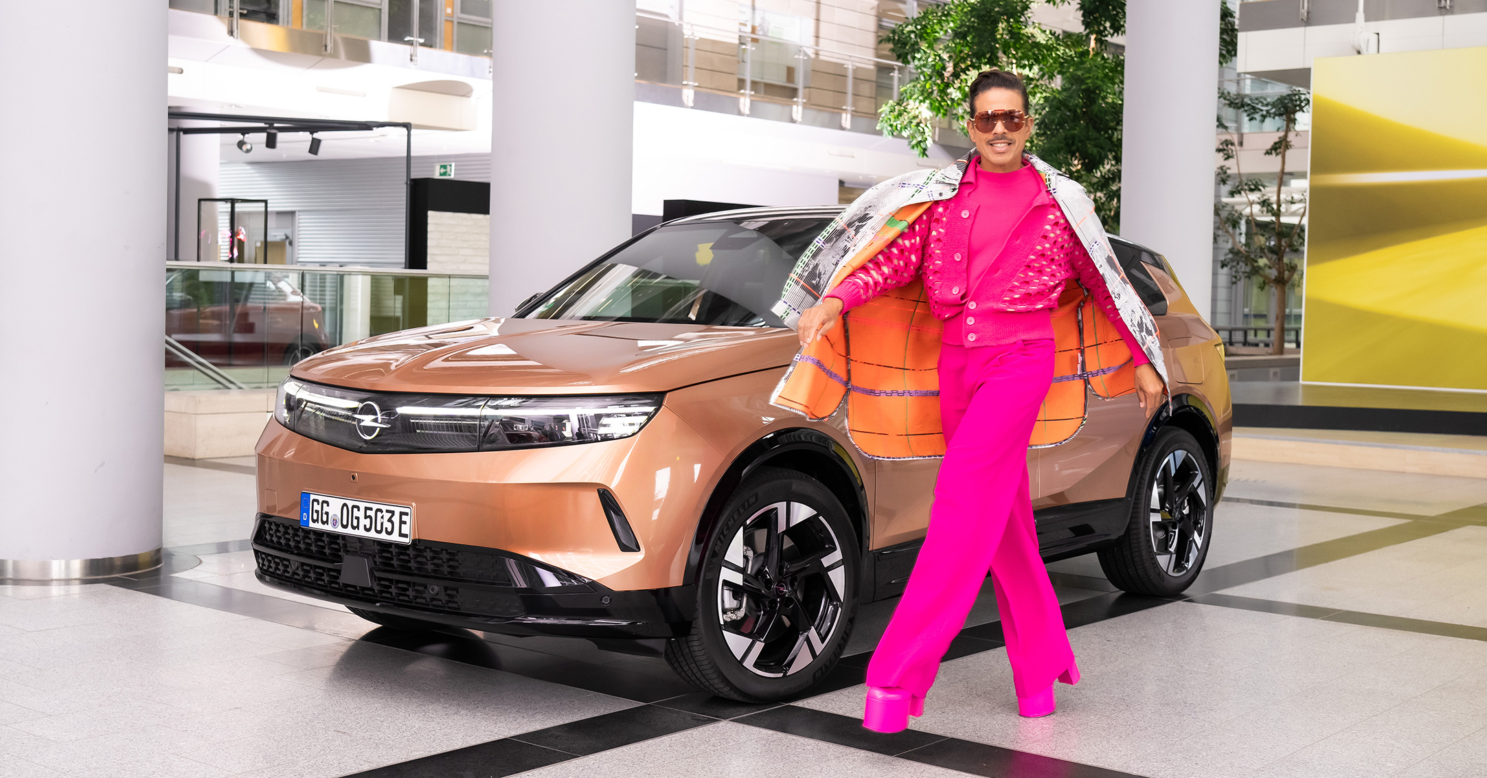 Pink! Natürlich! Und dazu jede Menge Plateau unter den Füßen. Jorge González weiß, wie man sich in Szene setzt. Es ist sein Markenzeichen. Und dafür lieben ihn seine Fans. Wir haben uns mit ihm im Adam Opel Haus verabredet – auf vier Fragen und schöne Bilder mit dem neuen Opel Grandland. Zuvor werfen wir noch einen Blick auf sein buntes Leben.