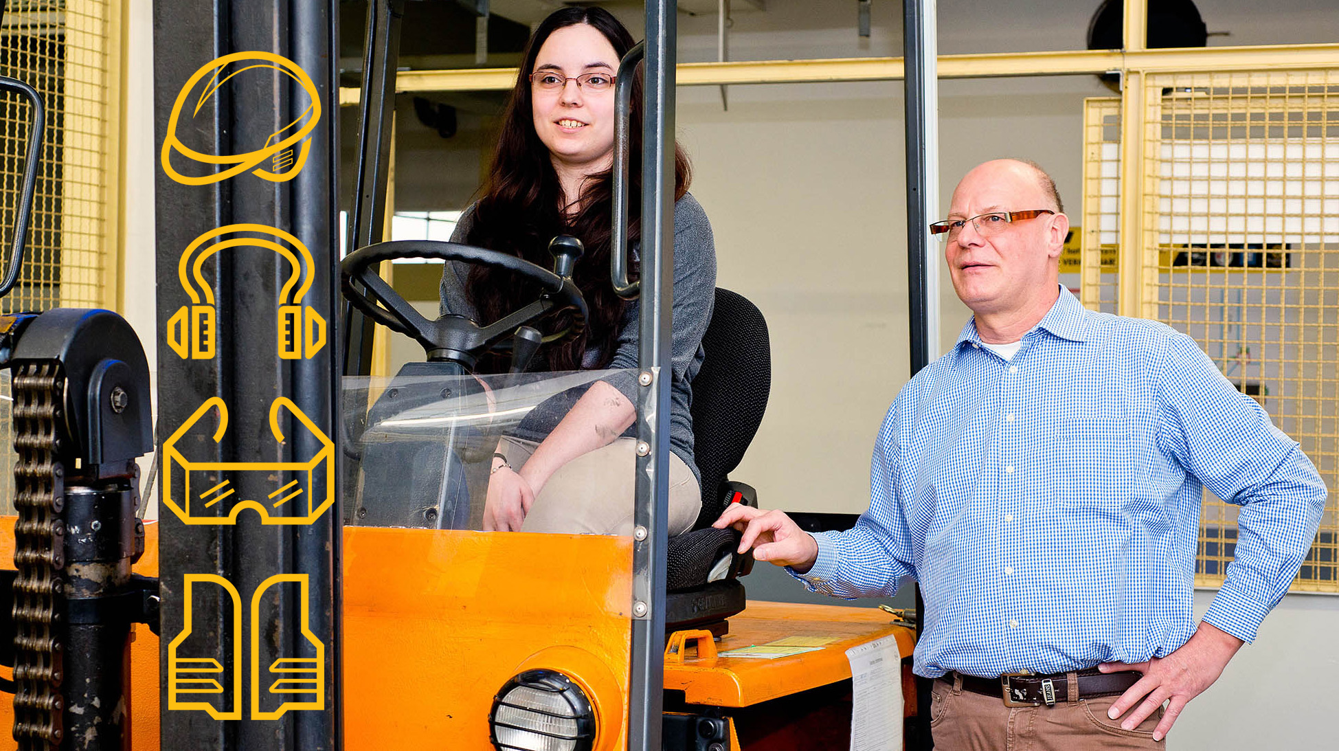 - Alles im Blick? Vanessa Jimenez-Jimenez überzeugt sich mal selbst, wie eingeengt das Sichtfeld eines Staplerfahrers ist.
