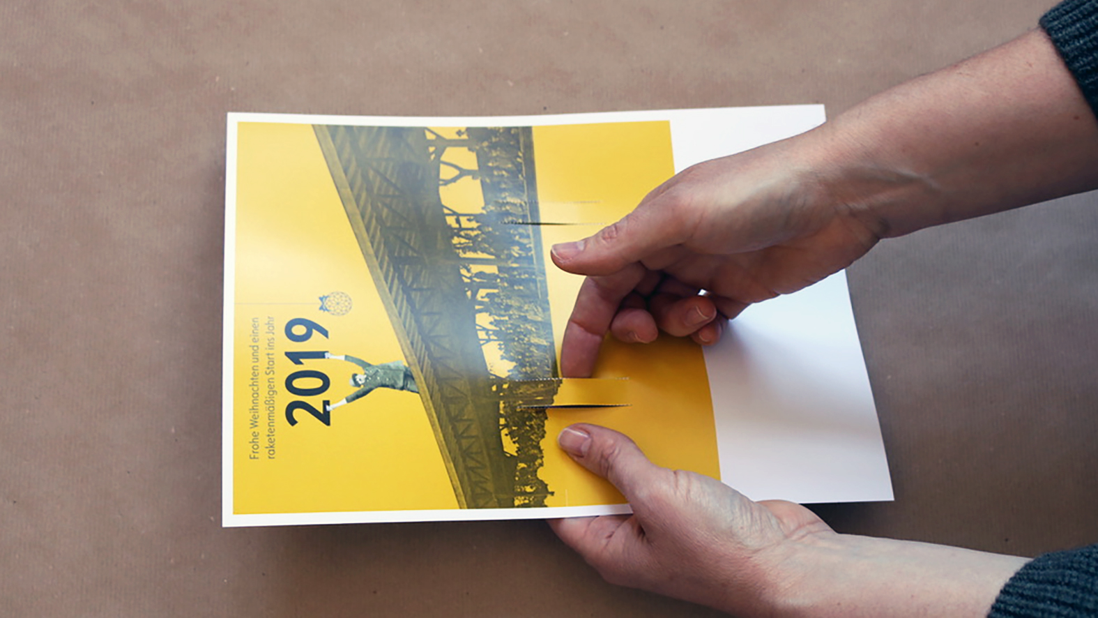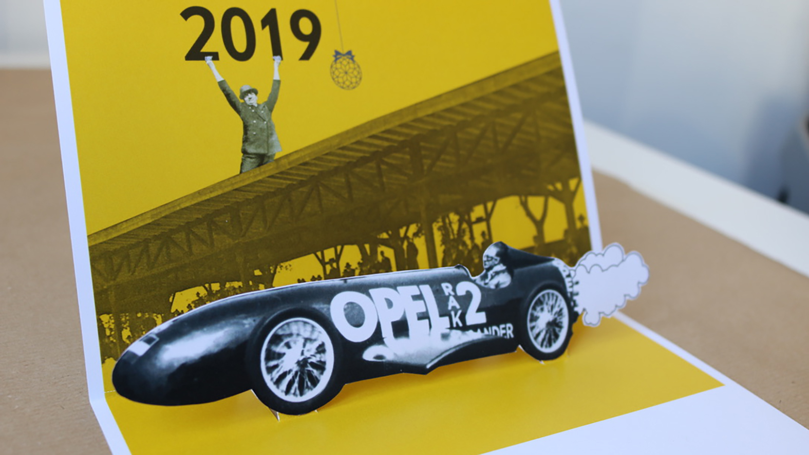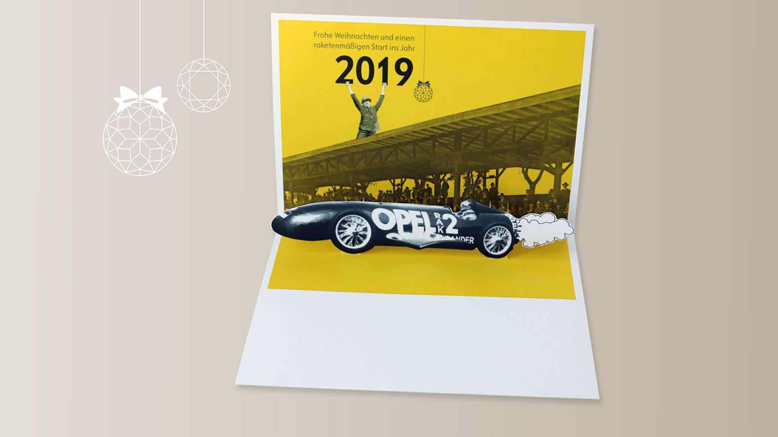 Wir erinnern mit unserer Weihnachtskarte an ein Jubiläum, das uns in diesem Jahr besonders begeistert hat: Vor 90 Jahren zündete Fritz von Opel 24 Pulverraketen am Heck seines RAK2 und jagte mit 238 km/h über die Berliner Avus. Vor tausenden Zuschauern läutete er damit das Raketen-Zeitalter ein. Wir haben aus einer Szene eine Pop up-Karte gestaltet, mit der Sie Ihren Lieben nun ganz einfach raketenmäßige Festtagsgrüße senden können.