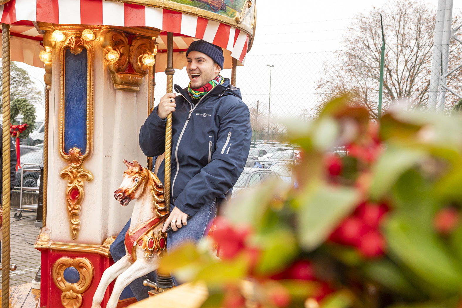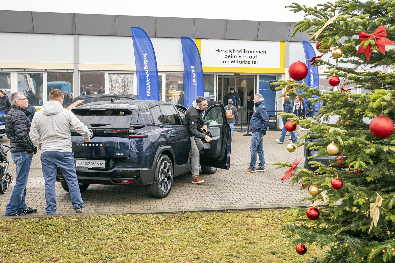 Der Duft von Stollenkonfekt, gebrannten Mandeln, knusprigen Churros und heißer Schokolade liegt über dem Gelände. Lichterketten und Adventsgestecke rahmen die Ausstellungsplätze, flankiert von der Stellantis-Modellpalette: ein Frontera im leuchtenden Rot-Orange, ein Jeep Avenger in tiefem Tannengrün. Und aus den Lautsprechern erklingt Driving Home for Christmas – ein Soundtrack, der den Tag auf den Punkt bringt.