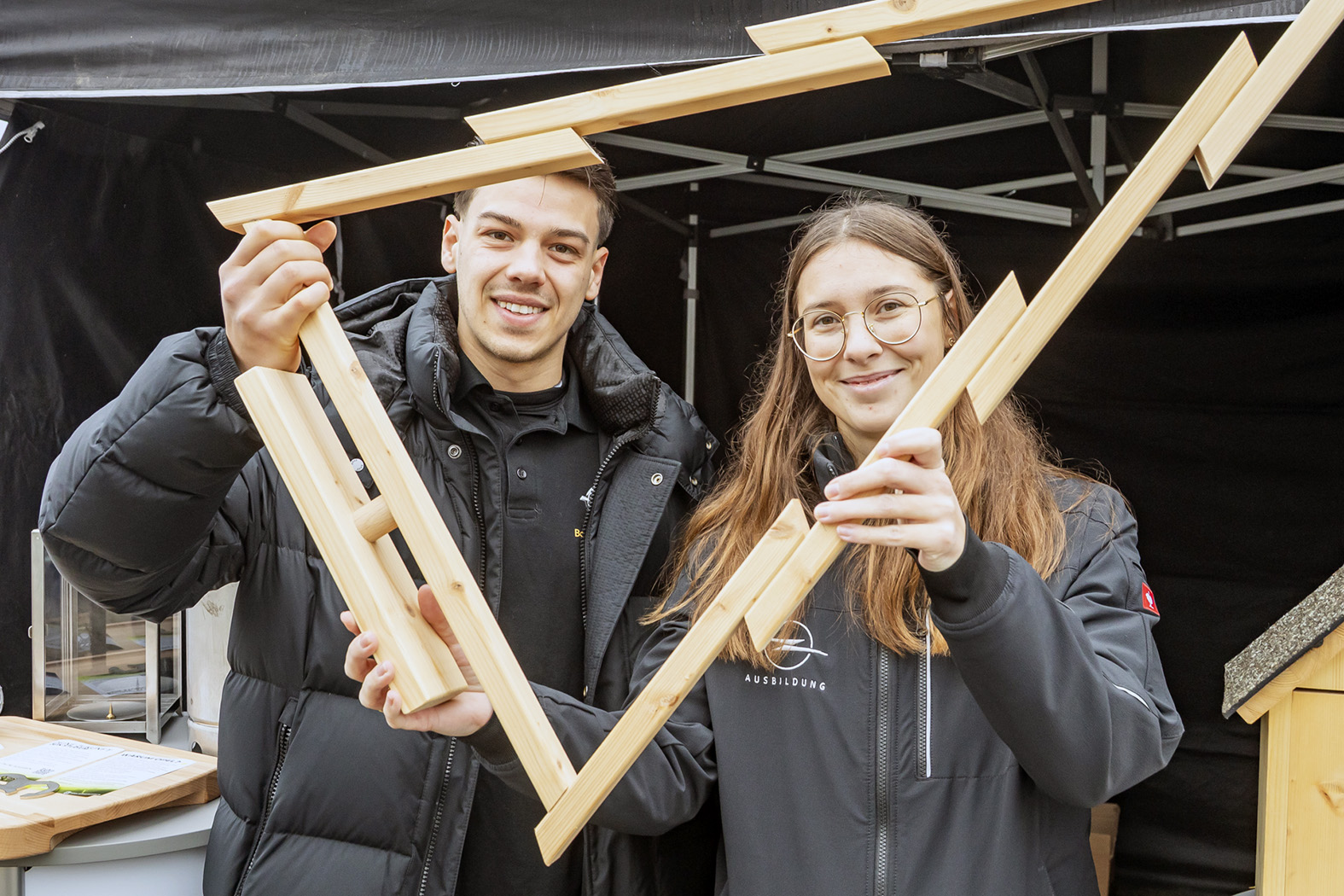 Nina Frehse und Fabian Dorn vom Azubi-Marketing präsentieren handgefertigte Geschenkideen der Opel-Azubis
