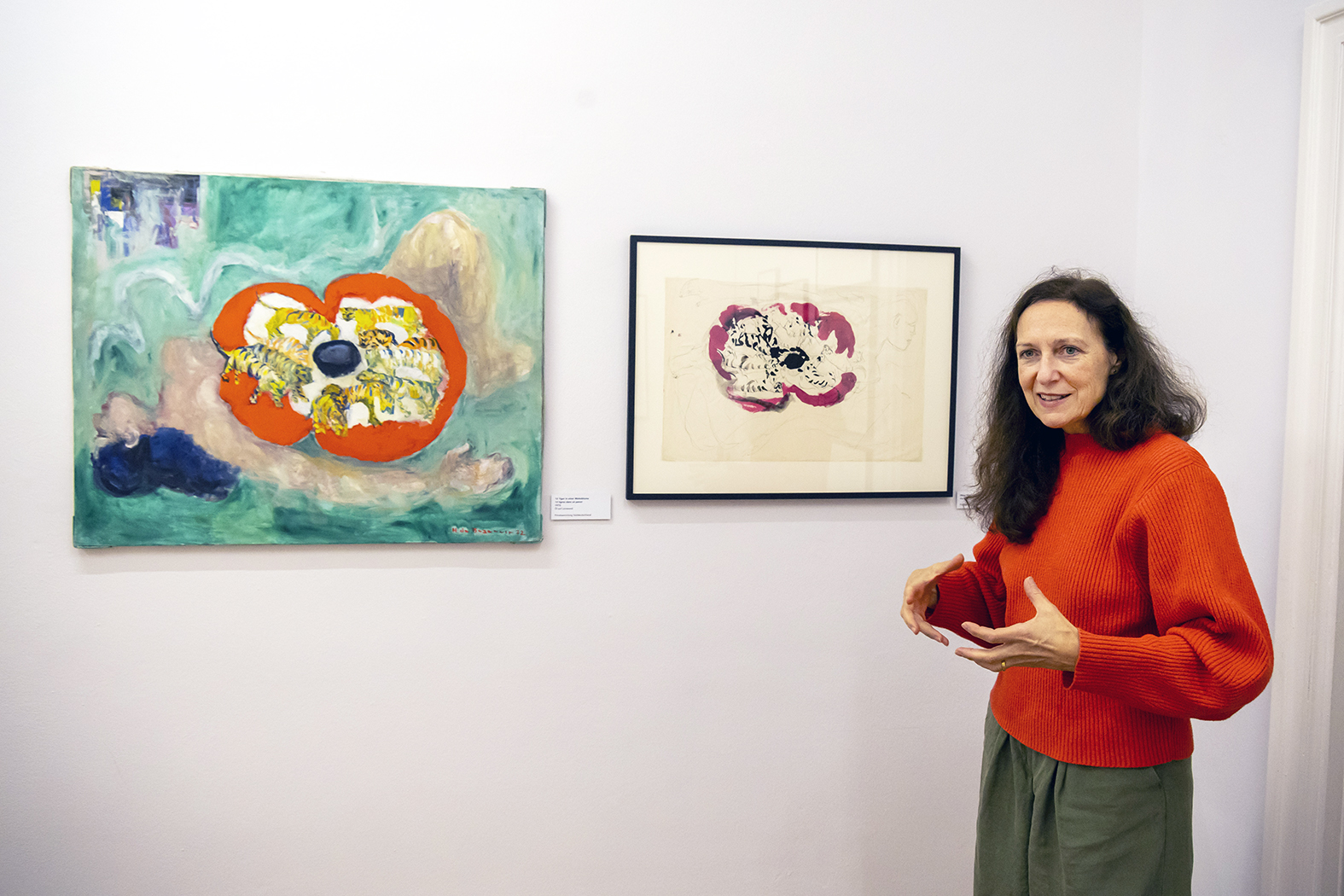 Für Beate Kemfert war es nur folgerichtig, die Ausstellung mit den späten Bildern zu beginnen – jenen intimen Darstellungen von Frauenkörpern, die kurz nach dem Tod ihrer Schwester Simone entstanden. Auf blauer Wand hängen dann bislang unentdeckte Ölbilder, die Hélène de Beauvoir zurückgezogen im Elsass Mitte der 1960 Jahre schuf. „Das war für sie ein Wendepunkt, fast eine Befreiung“, sagt Kemfert.