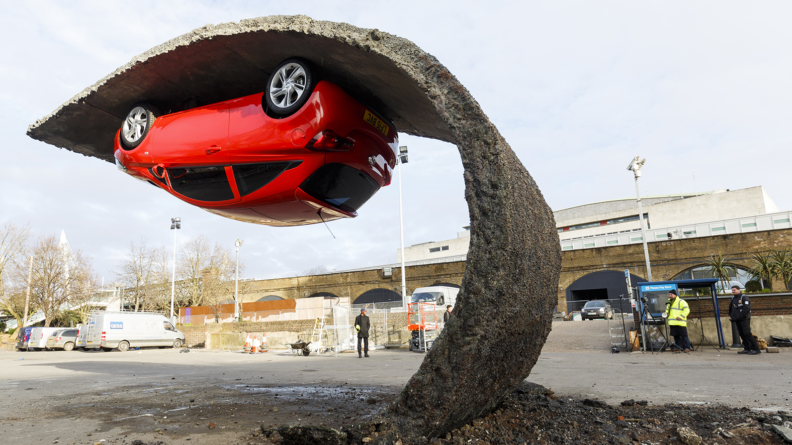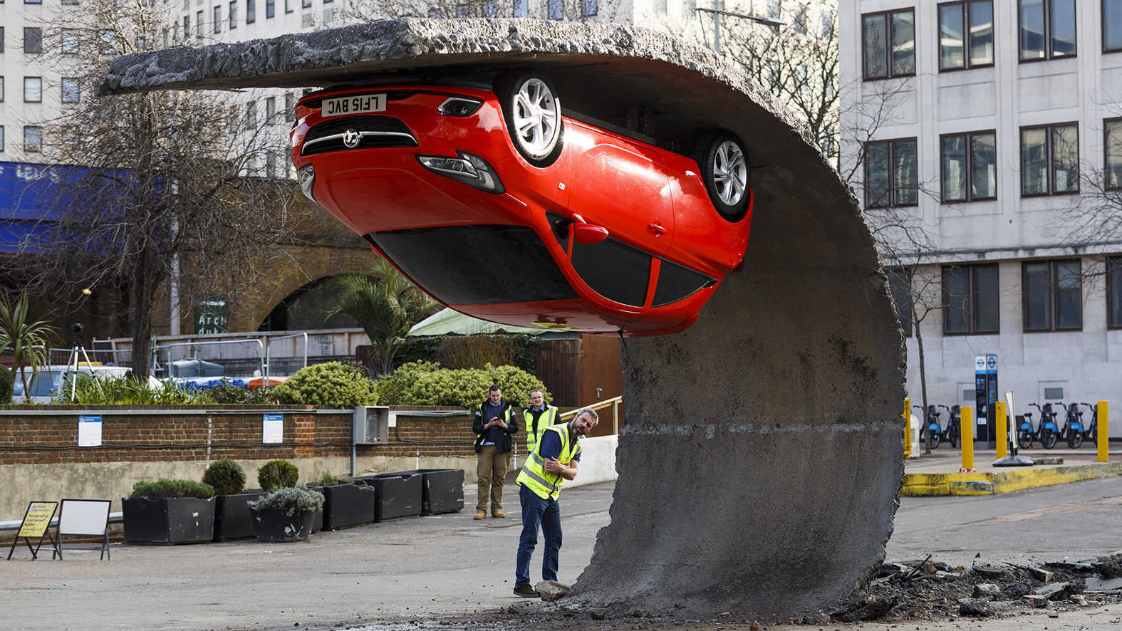 This car defies gravity. Instead of simply standing on the ground, the one tonne vehicle hangs upside down from arching tarmac with no visible support. ‘Pick yourself up and pull yourself together’ sees British artist Alex Chinneck suspend a new Vauxhall Corsa, 15 feet in the air at London’s Southbank Centre. The illusory artwork is the result of a collaboration with Vauxhall inspired by the new Corsa, which was launched earlier this year.