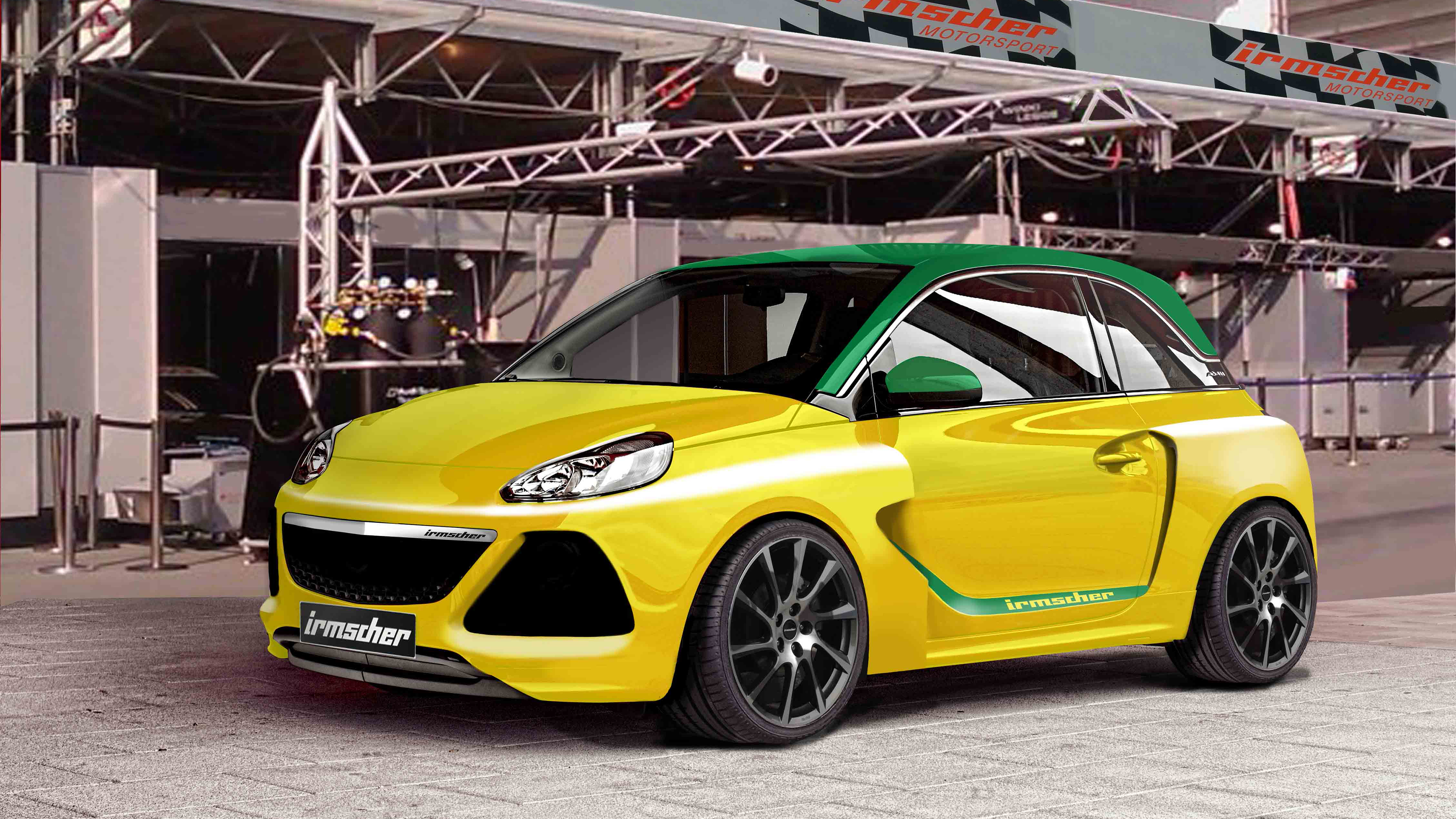Die Proportionen des Irmscher ADAM in gelb und grün werden gekennzeichnet durch eine ausladende Verbreiterungen sowie eine komplett überarbeitete Front- sowie Heckschürze. Unter den Seitenkästen sitzen die speziell angefertigten Irmscher Turbo Star Exclusiv Räder, die für eine optimale Straßenlage sorgen. Im Innenraum warten sportliche Sitze in Lederausstattung sowie Fußmatten mit einem speziell für dieses Konzeptfahrzeug designten Logo.